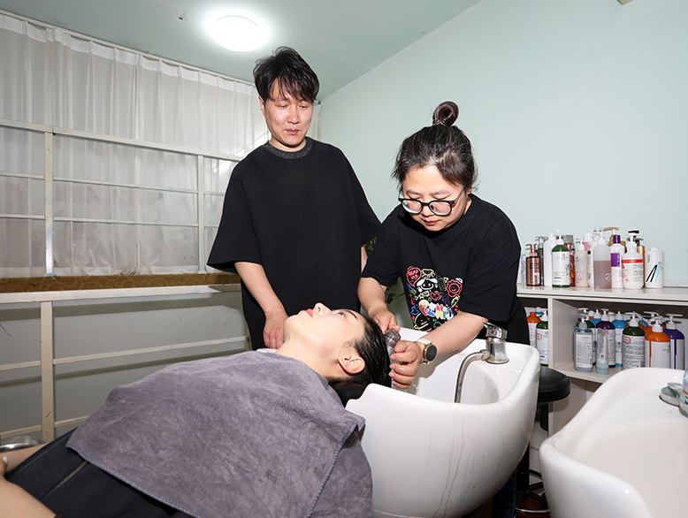 溫?zé)岬乃鲝膰婎^傾瀉而下,輕柔浸潤顧客發(fā)絲,記者屏氣凝神,指尖帶著試探性的力道,緩緩揉搓顧客頭皮,聲音里藏著忐忑:“這個力度合適嗎?”隨著時間的推移,記者的動作變得笨拙。一旁的曹家國見狀寬慰:“剛開始都這樣,等練出肌肉記憶,自然就得心應(yīng)手了。”