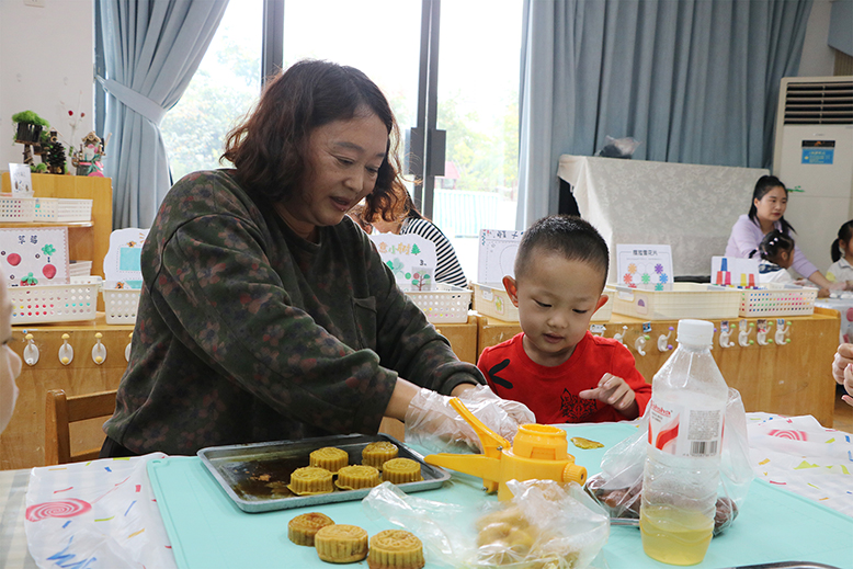 “老師,我要做豆沙餡的!像奶奶買的一樣甜!”小班教室內(nèi),幼兒李婳舉著沾了面粉的小手,湊到老師面前大聲說(shuō)。教室課桌上早已鋪好桌布,一次性手套、月餅?zāi)>?、揉好的面團(tuán)與各色餡料整齊擺放,家長(zhǎng)們挽起衣袖,與孩子面對(duì)面坐成一圈,一場(chǎng)“親子月餅工坊”熱鬧開(kāi)營(yíng)。
