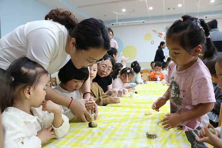 “先把面團(tuán)搓圓,像揉小皮球一樣,再輕輕壓扁……”小班教室內(nèi),教師高婷婷蹲在孩子們中間,掌心托著面團(tuán)放慢動(dòng)作示范,指尖捏出的圓潤(rùn)弧度,引得孩子們紛紛模仿。“哎呀,餡漏出來(lái)啦!”?。?)班呂梓成急得直跺腳,媽媽李女士立刻握住他的小手,手把手幫他把面團(tuán)捏緊:“沒(méi)關(guān)系,我們像給小包子‘封口’一樣,慢慢捏就好啦。”在家長(zhǎng)的協(xié)助下,呂梓成終于用模具印出了漂亮的月餅,他高興地舉著作品跑向老師:“老師您看!我成功了!”