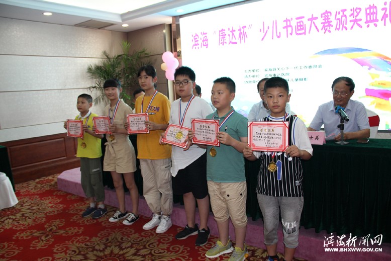 康鈞介紹了此次書畫大賽籌辦情況,他表示,此次少年兒童書畫大賽,意在通過一幅幅色彩明快、充滿正能量的書畫作品,向建國70周年獻上一份厚禮,給全縣的青少年書畫愛好者搭建一個展示才華和展現風采的舞臺,傳承康達醫(yī)院長期以來堅持捐資助學的美德。此次大賽參賽者年齡在7-12歲。從籌備到比賽歷時近1個月,期間共收到參賽報名表260余份,比賽現場完成書法、繪畫作品198幅。從書畫的才藝來看,這些作品不僅反映了孩子們的才藝水平,更充滿著孩子們對祖國未來的美好憧憬。經縣書畫家藝術協會評委老師的精心點評,共評選出繪畫作品一等獎1名、二等獎5名、三等獎9名,書法作品一等獎1名、二等獎3名、三等獎6名;單位優(yōu)秀組織獎7個,最佳指導獎2個??碘x說,希望同學們能始終保持這樣的熱情,在今后文化課學習之余,拿起筆墨紙硯,展開想像的翅膀,敞開心靈的窗口,盡情地揮灑才情,用一顆火熱的心去描摹自然、體驗世界,創(chuàng)作更多更好的書畫作品,為自己的生活增添美麗色彩,也為全國書法之鄉(xiāng)濱海爭光添彩。