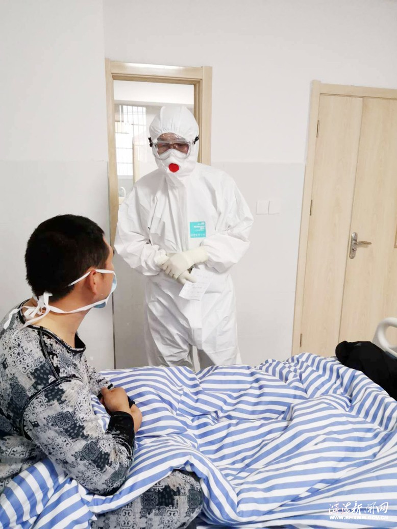 在隔離病房,沈玉成從頭武裝到腳,防護服、護目鏡、帽子、口罩、鞋套、手套等把他身體裹得密不透風,每次查房1個多小時,他的后背就濕透了?!懊刻於伎梢宰龊脦讉€小時的‘桑拿’,想想也很不錯!”沈玉成調(diào)侃而樂觀地向筆者描述工作情景。