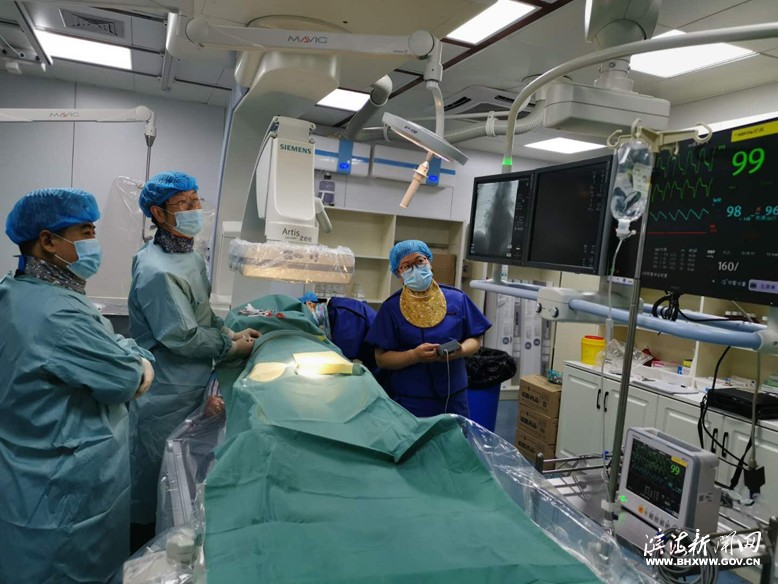 康凱火速趕到四樓ICU室,與大家一起會(huì)診認(rèn)為:患者果真為急性廣泛前壁心肌梗死,病情已十分危重,隨時(shí)有生命危險(xiǎn)。他當(dāng)機(jī)立斷:迅即進(jìn)行急診冠狀動(dòng)脈造影介入手術(shù)。接到通知,導(dǎo)管室所有人員5分鐘全部到位,立即進(jìn)行術(shù)前準(zhǔn)備。下午3:30左右,周某被緊急轉(zhuǎn)至導(dǎo)管室進(jìn)行冠狀動(dòng)脈造影術(shù),由康凱主刀,心內(nèi)科主任徐江兵、醫(yī)師杜娟協(xié)助。在脈造影中發(fā)現(xiàn)患者左冠狀動(dòng)脈前降支99%狹窄,遠(yuǎn)端血流明顯受阻,便進(jìn)行球囊擴(kuò)張開通血流,并植入3.5×23mm支架1枚,造影顯示狹窄部位已擴(kuò)開血流恢復(fù),引起急性心肌梗死幾乎閉塞的冠狀動(dòng)脈已經(jīng)解除狹窄,患者胸痛癥狀當(dāng)即顯著緩解,整個(gè)手術(shù)持續(xù)半個(gè)多小時(shí)圓滿結(jié)束,一個(gè)垂危的生命重獲新生,患者家屬喜極而泣,連聲道謝。