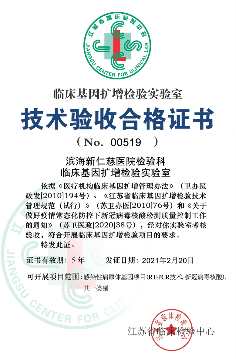 2月20日,濱??h新仁慈醫(yī)院PCR實驗室順利通過江蘇省臨床檢驗中心審核驗收,正式投入使用,為今后疫情防控工作常態(tài)化和感染性疾病科的發(fā)展提供了堅實的基礎(chǔ)條件。該院PCR實驗室可開展的檢驗項目為感染性病原體基因項目(RT-PCR技術(shù),新冠病毒核酸)。