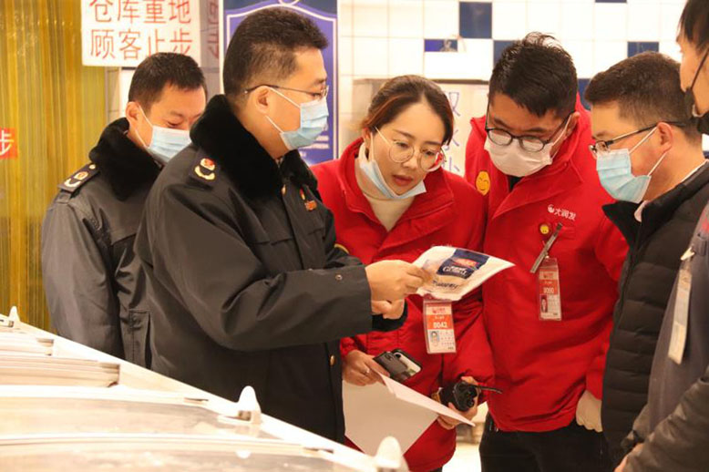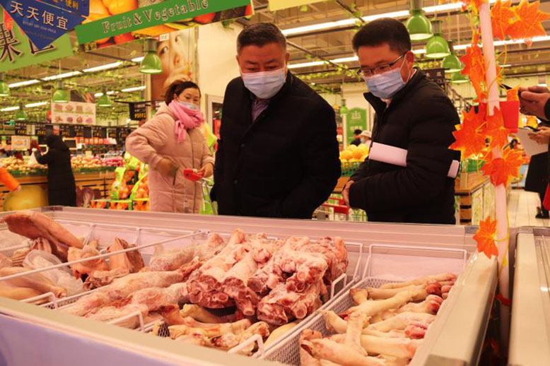 縣市場監(jiān)管局領導(左)檢查超市肉制品