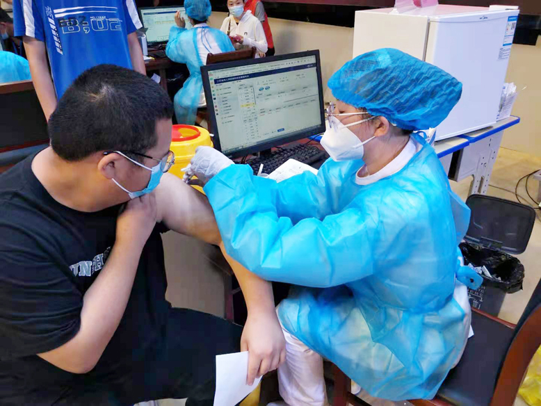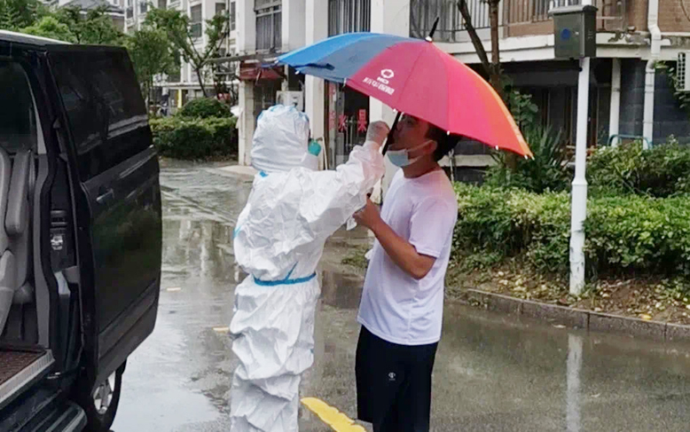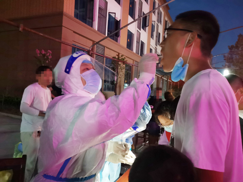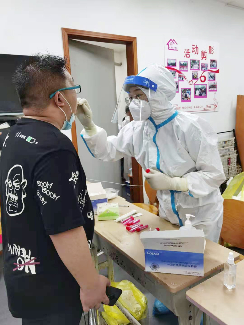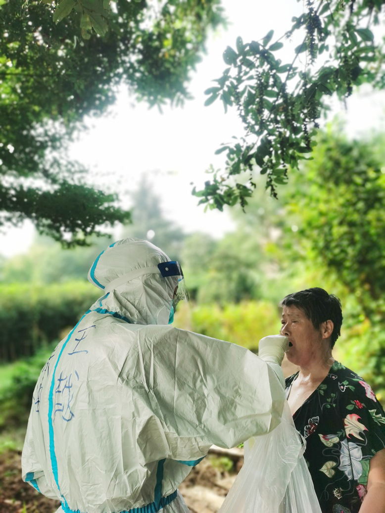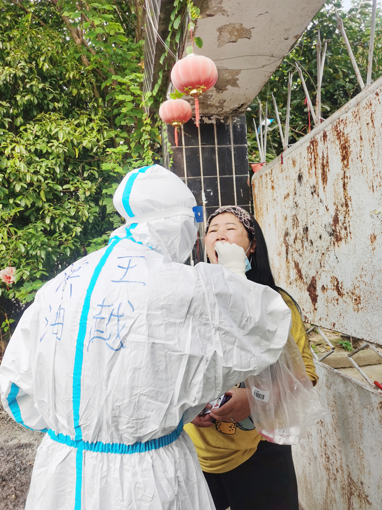 8月4日夜晚,當(dāng)該院接到縣衛(wèi)健委馳援揚(yáng)州的命令后,在家負(fù)責(zé)醫(yī)務(wù)工作的副院長(zhǎng)單杉林馬上同其他領(lǐng)導(dǎo)會(huì)商后連夜開(kāi)展緊急動(dòng)員,很快從志愿者中選出胡曉雨、沈亞、陸雅翠、陳昊月、潘金玉共5位年輕護(hù)士組成了支援揚(yáng)州抗疫小組,經(jīng)過(guò)簡(jiǎn)單的獻(xiàn)花送行儀式,第二天上午9點(diǎn)就同全縣抽調(diào)的其他醫(yī)護(hù)人員一道向揚(yáng)州進(jìn)發(fā)。下午4點(diǎn)多,她們五姐妹就被指定到蓮花社區(qū)開(kāi)始對(duì)當(dāng)?shù)鼐用襁M(jìn)行核酸采集工作,一直忙到夜里近10點(diǎn),她們共采集核酸標(biāo)本5396份。尤其是骨科護(hù)士胡曉雨家里有個(gè)僅3歲的孩子,平時(shí)一天也離不開(kāi)母親的照料。為支援揚(yáng)州抗疫,她毅然決定將孩子送至家住響水的母親那里,自己義無(wú)反顧地率先報(bào)名讓院里挑選。8月7日,經(jīng)過(guò)持續(xù)3天在烈日下超負(fù)荷工作,沈亞、陸雅翠等4名護(hù)士出現(xiàn)輕微中暑現(xiàn)象,揚(yáng)州中醫(yī)院的同伴馬上為她們送來(lái)藿香正氣水、風(fēng)油精涂用后,她們又繼續(xù)投入了現(xiàn)場(chǎng)核酸采集工作,分秒必爭(zhēng)地為當(dāng)?shù)鼐用窨箵粢咔槎嘧髫暙I(xiàn)。