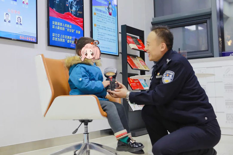 “謝謝警察叔叔!”幾天之后,這名小孩子將一只手工涂色的人偶送到了警務站,并在玩偶背后寫下了這6個歪歪扭扭的小字。現(xiàn)在這個玩偶被放在警務站醒目處,成為警務站定期開辦的“萌娃進警營活動”中防走失、防拐騙宣傳的重要道具之一。