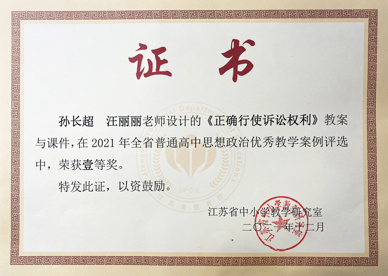 在2021年全省普通高中思想政治優(yōu)秀教學(xué)案例評(píng)選中,明達(dá)中學(xué)孫長超、汪麗麗老師設(shè)計(jì)的《正確行使訴訟權(quán)利》榮獲一等獎(jiǎng)。
