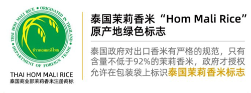 泰國(guó)商業(yè)部外貿(mào)廳注冊(cè)了泰國(guó)香米質(zhì)量標(biāo)準(zhǔn)認(rèn)證標(biāo)志:Thai Hom Mali Rice(泰國(guó)茉莉香米)綠色圓形的原產(chǎn)地注冊(cè)標(biāo)志。