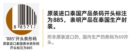 原產(chǎn)地包裝原裝進(jìn)口泰國(guó)香米的包裝條形碼以88開(kāi)頭,“69”條碼的泰國(guó)茉莉香米則是在國(guó)內(nèi)分裝的。