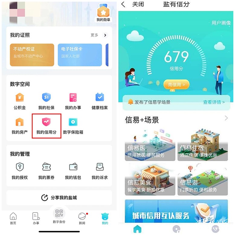下載“我的鹽城”APP進(jìn)行注冊(cè),注冊(cè)成功后點(diǎn)擊右下角“我的”,點(diǎn)擊“我的信用分”,即可查看個(gè)人信用信息。