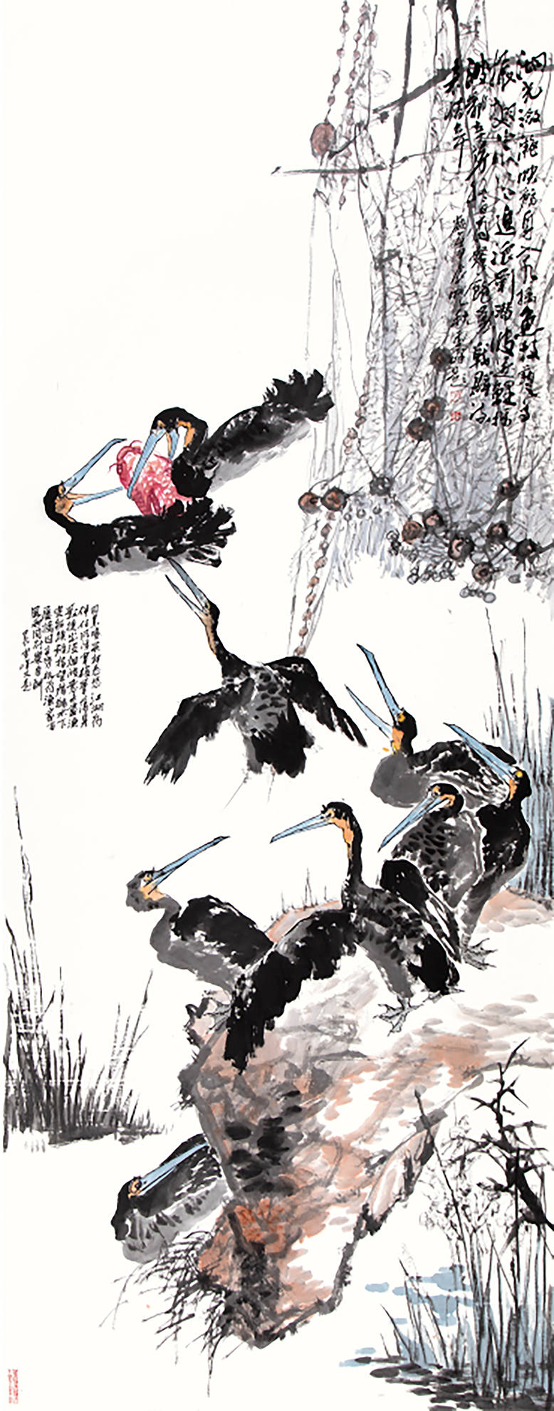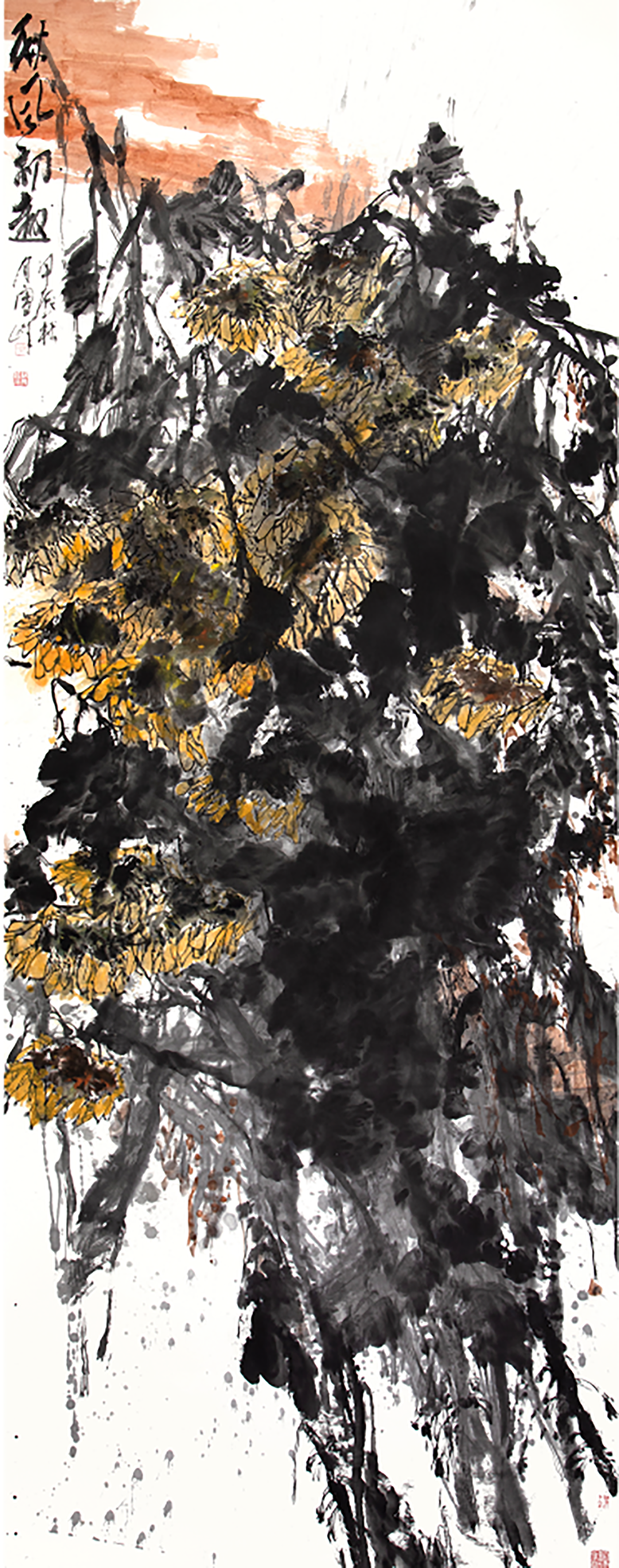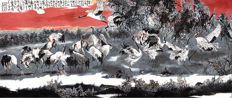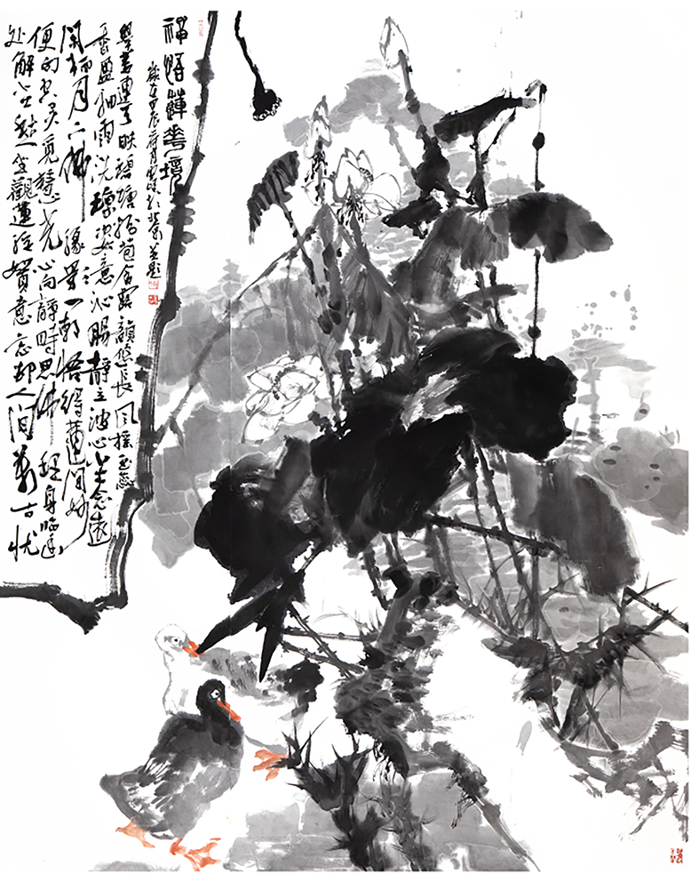 大寫意花鳥畫是國畫大寫意中難度極高的畫種。鹽城灘涂的生態(tài)奇觀與蒼茫氣象是謝雪峰筆墨情懷的承載。丹頂鶴、鴕鳥、麋鹿、孔雀、水鴨等禽鳥獸類,佐以葵花、荷花及諸多山花野卉的自然點(diǎn)綴,以不同的儀態(tài)和組合展現(xiàn)在他的筆下。謝雪峰以自己筆墨語言在工業(yè)文明的浪潮中守護(hù)著內(nèi)心的故鄉(xiāng)。特別值得關(guān)注的是謝雪峰對筆墨本體的深入挖掘。思考始終伴隨創(chuàng)作,他近年的這批巨制堪稱為中國寫意精神當(dāng)代性的一場筆墨思辨。他未沉溺在書齋清供的雅致趣味里,而是選擇巨幅生宣上釋放心性與情懷,讓千年文人畫審美獲得了舒展與嬗變。巨幅創(chuàng)作絕非小品的簡單放大,二者交互印證中為我們展示了新的筆墨、新的構(gòu)成和新的經(jīng)驗(yàn)。謝雪峰的藝術(shù)實(shí)踐證明,傳統(tǒng)的延續(xù)既不是對程式的膜拜,也不是對古典的蔑視與割裂,而是對筆墨本體與古典審美意識的正視、尊重與深度叩問,并最終尋得中國大寫意精神的新表現(xiàn)。
